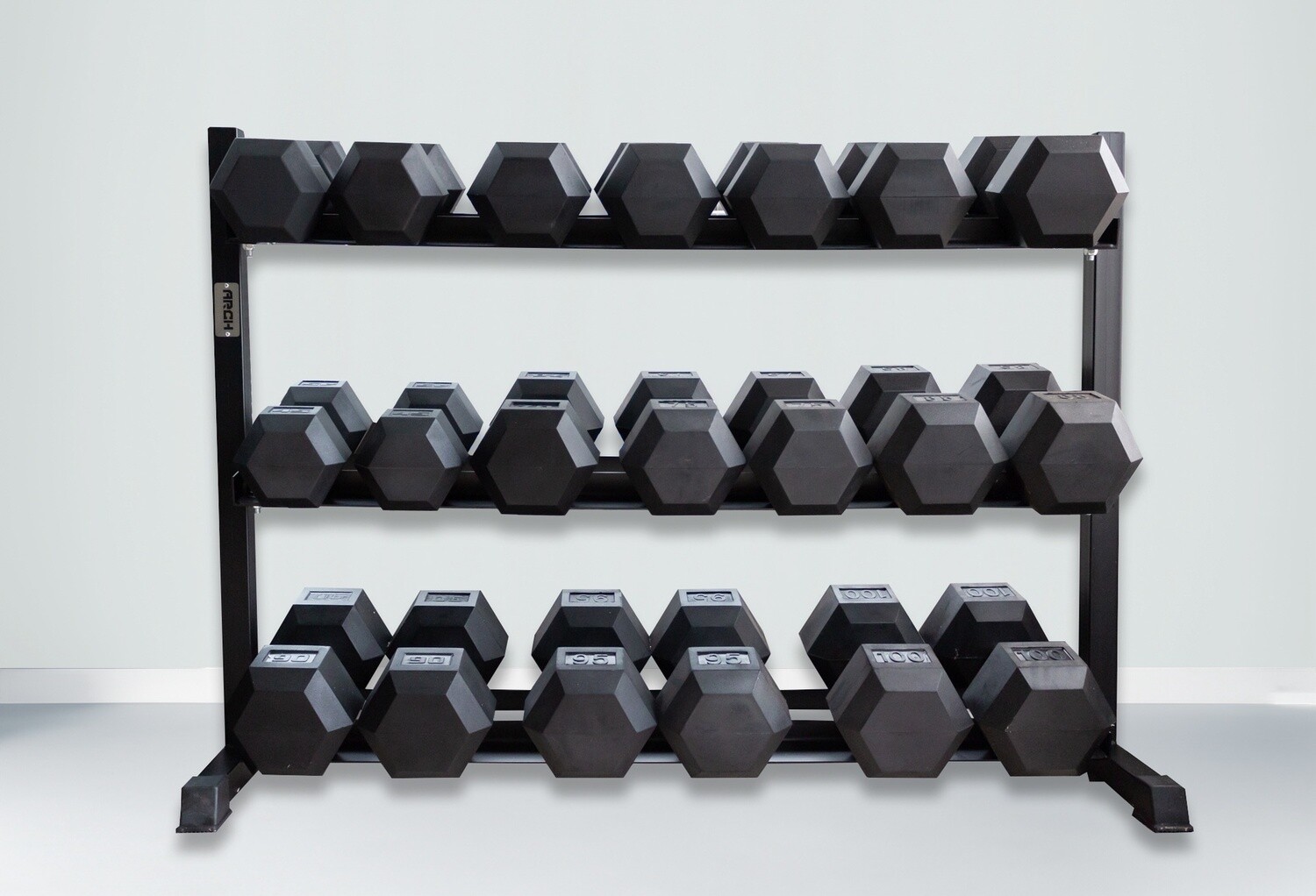 The Arch Series hex dumbbells ranging from 5-100 pounds is a must-have for any home or commercial gym. These dumbbells are crafted from high-quality materials and finished with a durable hexagon-shaped head to prevent rolling, ensuring your safety during workouts.